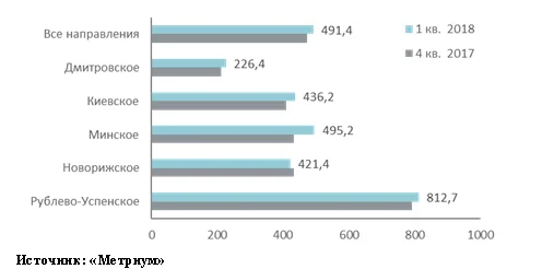 По подсчетам аналитиков, средняя цена кв. метра на первичном рынке загородной недвижимости по состоянию на конец марта 2018 года составила 130,3 тыс. рублей, что на 3% выше в сравнении с предыдущим отчетным периодом. Корректировка показателя вызвана преимущественно изменением структуры предложения. Также по нескольким проектам отмечено прямое повышение цен. Кроме того, влияние оказал рост курса доллара (часть лотов экспонируется в валюте). В зависимости от направления динамика была разнонаправленной. Корректировка в отрицательную сторону произошла на Минском (-11,2%) и Новорижском шоссе (-2,3%). В остальных случаях средний показатель вырос: на Киевском и Дмитровском шоссе – на 1,9%, на Рублево-Успенском – на 11%.