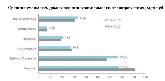 По итогам первого квартала 2018 года средняя площадь дома составила 491,4 кв. метр. За отчетный период показатель увеличился на 3,8%, что связано с изменением структуры предложения. По четырем направлениям средний размер домовладения показал положительную динамику: Рублево-Успенское (+2,7%), Минское (+14,6%), Киевское (+6,4%) и Дмитровское (+7,2%). Уменьшение средней площади отмечено только на Новой Риге (-2,5%).