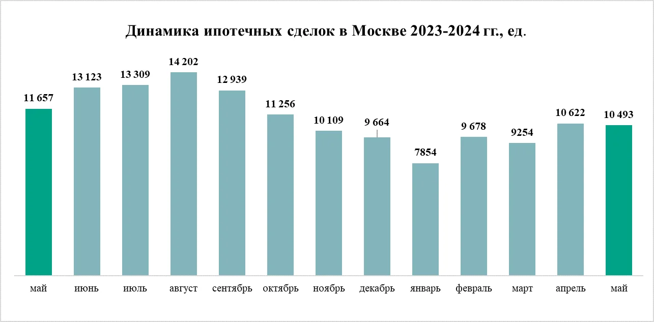 Количество ипотечных сделок в мае 2024 года в Москве незначительно снизилось. Заемщики получили в банках на покупку первичного и вторичного жилья 10,5 тыс. кредитов, что на 1% меньше, чем месяцем ранее, когда Росреестр зарегистрировал 10,6 тыс. ипотечных сделок. Однако по сравнению с маем 2023 года покупатели жилья в Москве получили на 10% меньше кредитов.