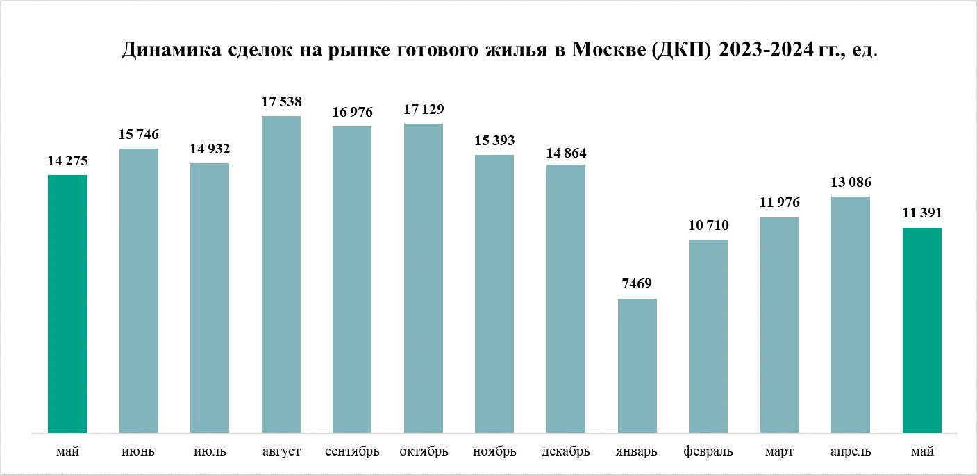 На рынке готового жилья (квартиры от частных владельцев и готовые новостройки от девелоперов) в мае 2024 года число сделок снизилось на 13%. Росреестр зарегистрировал 11,3 тыс. договоров купли-продажи против 13,1 тыс. соглашений в апреле. В то же время по сравнению с маем 2023 года активность покупателей готового жилья в столице снизилась на 20%.