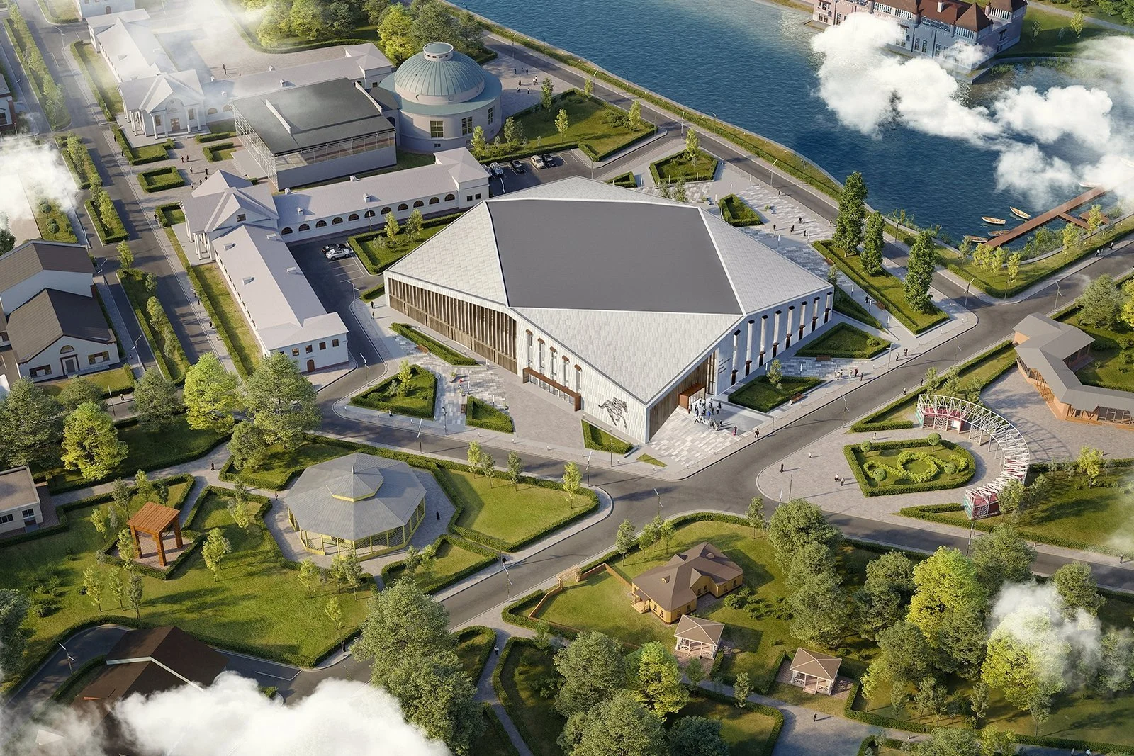 Что касается внутренней начинки комплекса, на первом этаже, помимо большого и малого манежей, расположатся тренерские комнаты, зона седловочных боксов, медицинский кабинет, помещения для хранения ветеринарных препаратов и инвентаря, а также раздевалки для спортсменов с душевыми кабинами. На втором — трибуны для зрителей, аппаратная с комментаторской, кафе на 44 места, кухня, раздевалки с душевыми и фойе. На третьем — ложа на 12 мест, два кабинета для гостей, комната отдыха и переговорная.