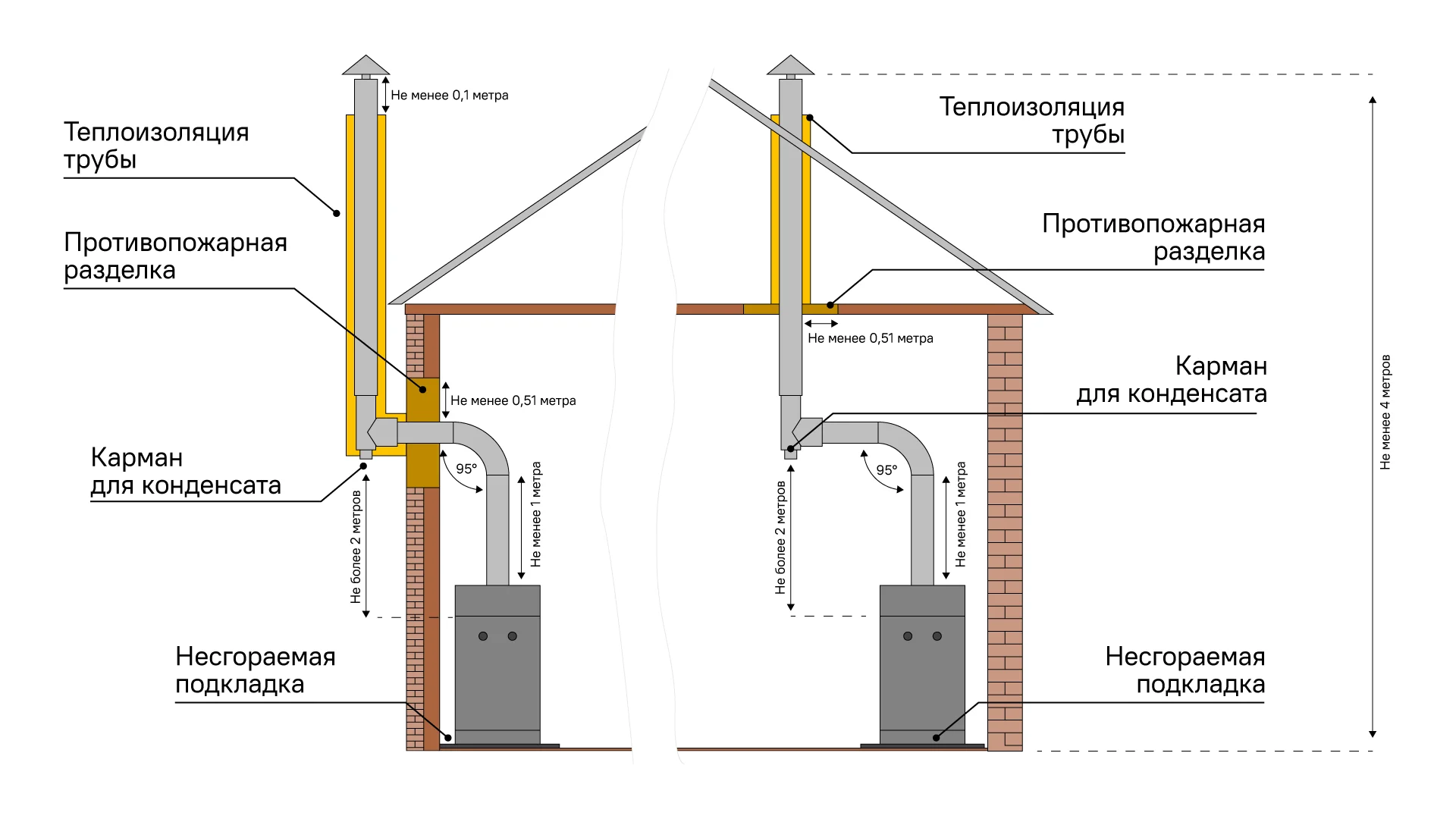 Дымоход выполняют из сборных железобетонных конструкций, глиняного кирпича, металла или неметаллических материалов, например, керамики. Диаметр газохода не должен превышать размеры выходного отверстия на котле. Место прохода через конструкции делают с использованием негорючих элементов, изоляцию делают по средствам базальта.