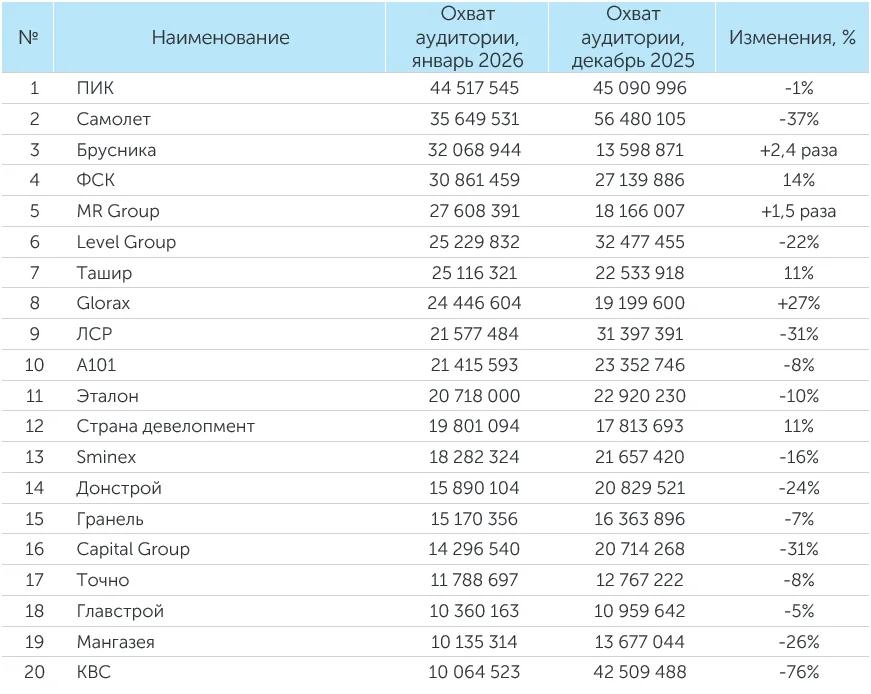 ГК «Брусника» заняла в январе 2026 года третью строчку по охвату аудитории с сообщением о том, что девелопер приобрел у «Самолета» часть проекта в подмосковных Люберцах.