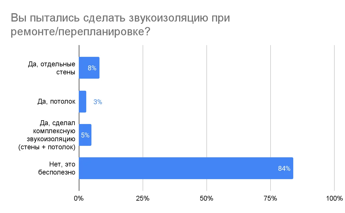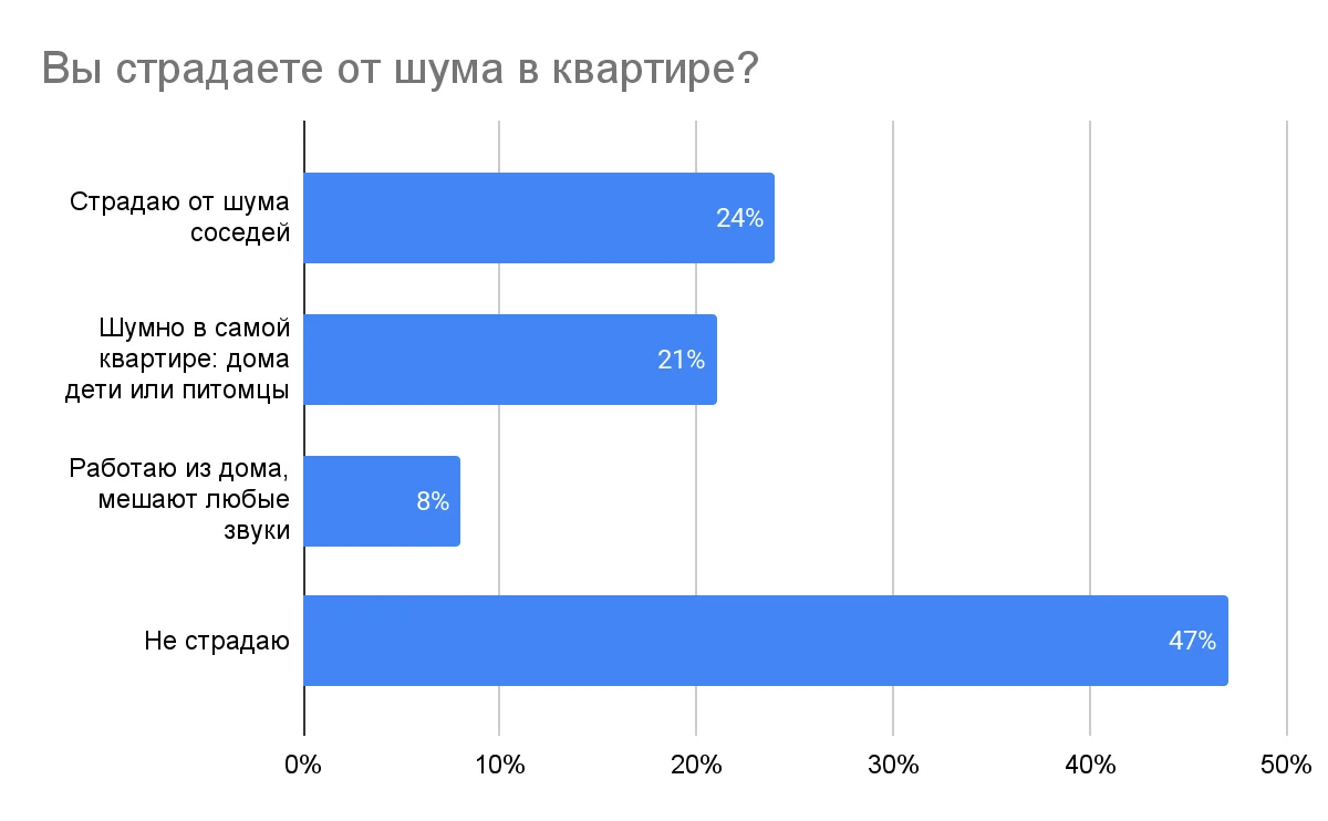 При этом из того же опроса видно, что более половины (53%) респондентов страдают от шума в квартире. Среди подтвердивших наличие проблемы 24% жалуется на соседей (в том числе на звук от ремонтных работ), практически столько же респондентов (21%) страдают от шума в собственной квартире (в основном издаваемого детьми или домашними питомцами). На последнем месте — жалобы на любые звуки (8%), главным образом от тех, кто работает на «удаленке» и кому мешает вообще все.