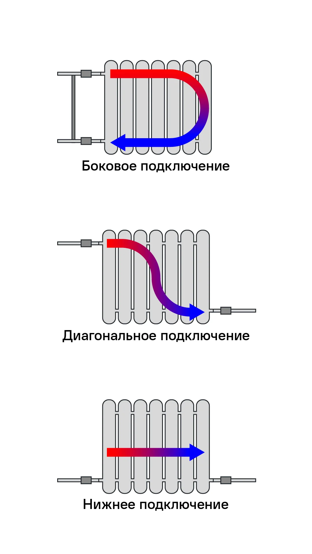 Существует несколько схем подключения биметаллических радиаторов отопления: боковое, диагональное, нижнее. Главное отличие между ними заключается в циркуляции теплоносителя в системе.