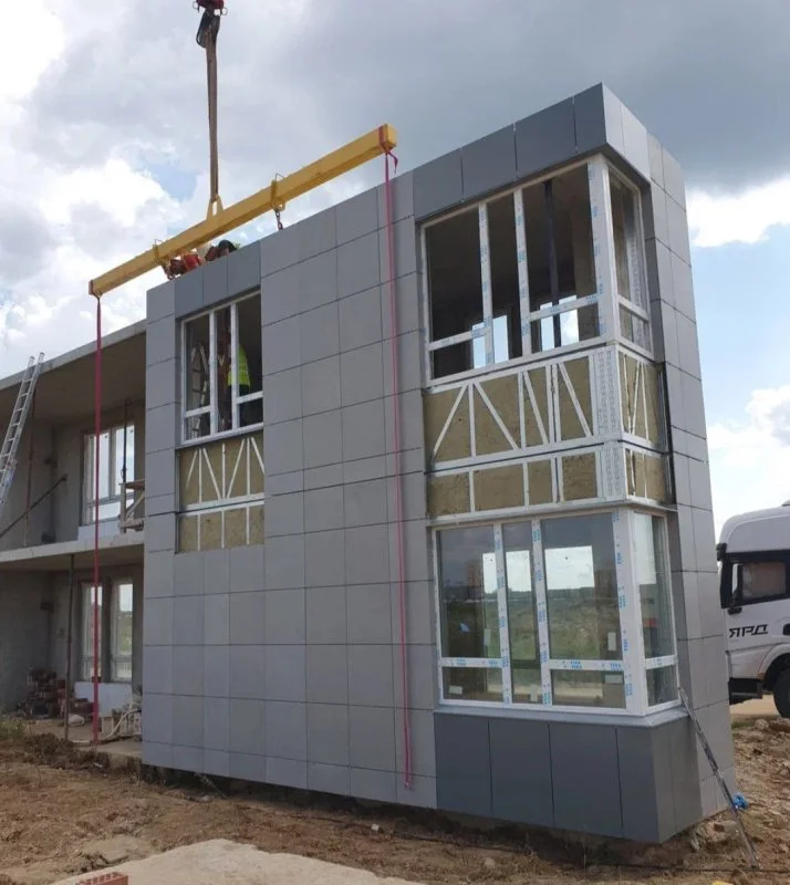 Ограждающая конструкция в составе модуля представляет собой внутреннюю обшивку из легкого бетона, обеспечивающую устойчивость модуля к изгибающим моментам и являющуюся основанием для внутренней отделки помещения. Особенность префаб-продукта (элемента заводской готовности) позволяет исключить мокрые процессы в возведении фасада здания в построечных условиях, после монтажа модуля перейти к чистовой отделке помещения, а также за счет комплектности системы без дополнительных работ по кладке увеличить продаваемую площадь без любых потерь. Если быть точным, модуль представляет собой комбинацию из силового каркаса из легкой стальной тонкостенной конструкции (ЛСТК), служащей «держателем» теплоизоляционного и пароизоляционного слоев, внутренней обшивки из легкого бетона, ветрозащитного слоя, обрешетки/подсистемы и облицовки.