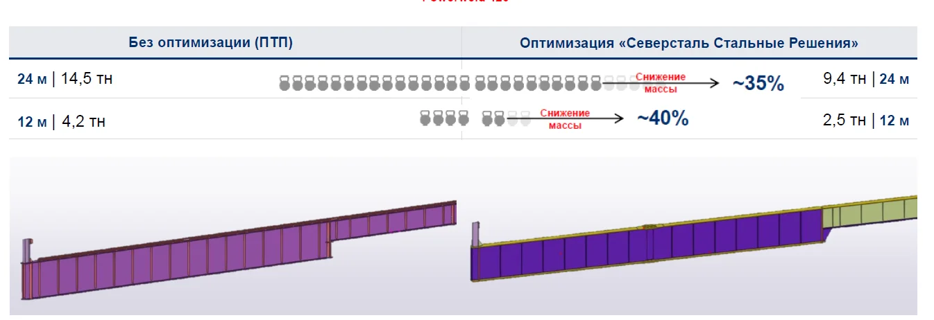 Примером такого подхода является проект «Стан-170» в Череповце, где суммарный эффект от оптимизации за счет использования новой марки стали Powerweld 420 составил 22 %. В этом случае для облегчения конструктива и снижения металлоемкости было принято решение использовать конструкционную сталь, специально разработанную под проект: она отличалась более высокими прочностными характеристиками от уже существующих «экспортных» продуктов и позволяла уменьшить сечения конструкций.