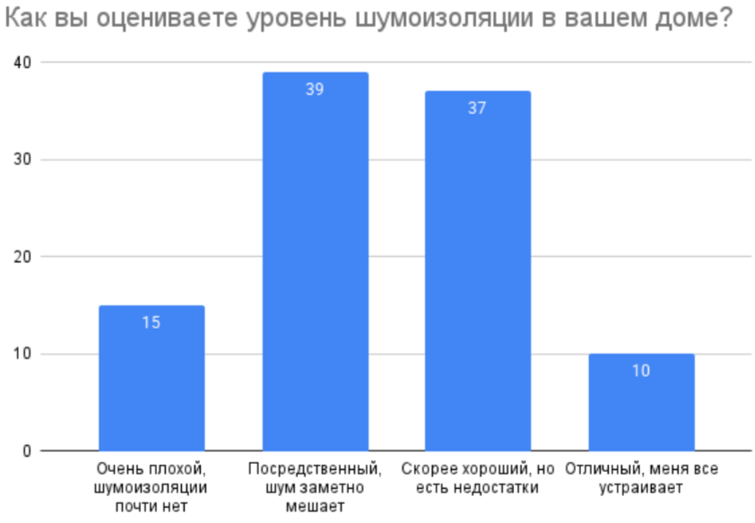 По данным опроса, 15% жителей новостроек заявили, что шумоизоляции в их доме «почти нет», еще 39% – что «шум заметно мешает». Лишь 10% довольны качеством звукоизоляции и оценивают ее как «отличную». Таким образом, более половины жителей новостроек (54%) живут в условиях, где звуки соседей и улицы мешают отдыхать и работать.