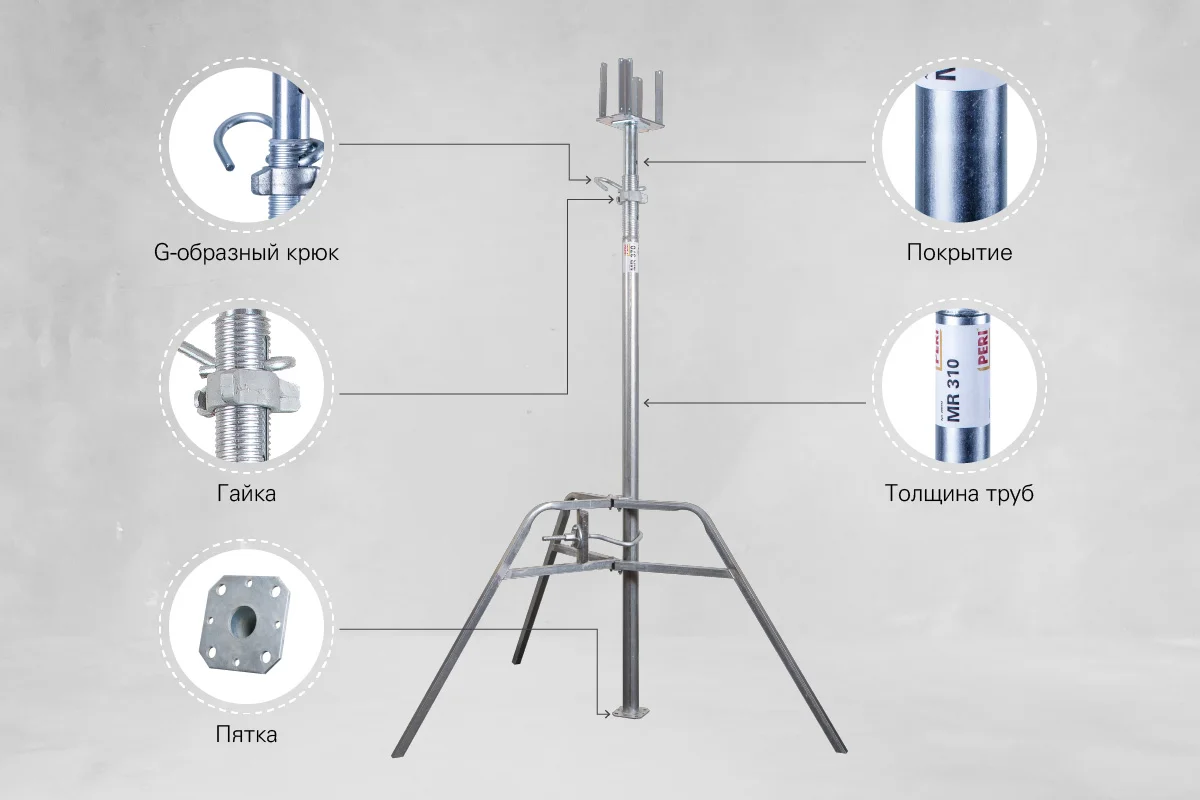 Большую роль играет диаметр сечения G-образного крюка: от этого зависит несущая способность стойки в целом, поскольку крюк воспринимает вертикальные усилия от нагрузок при монтаже опалубки перекрытия и бетонировании. Хорошо, если этот показатель будет порядка 14 мм.