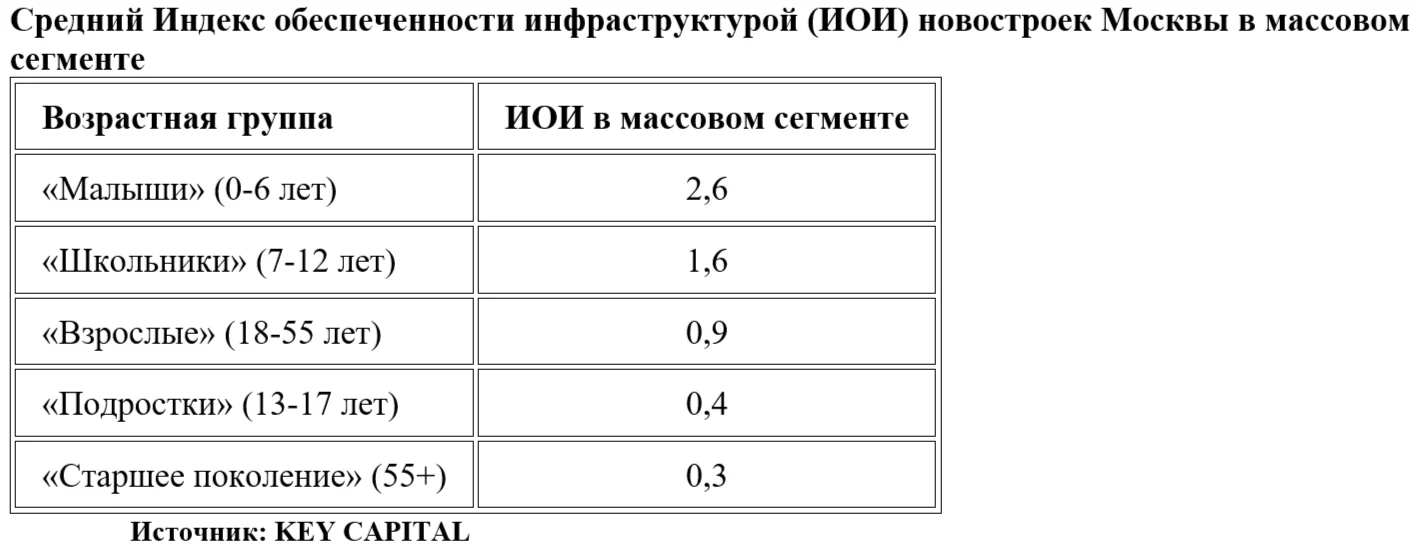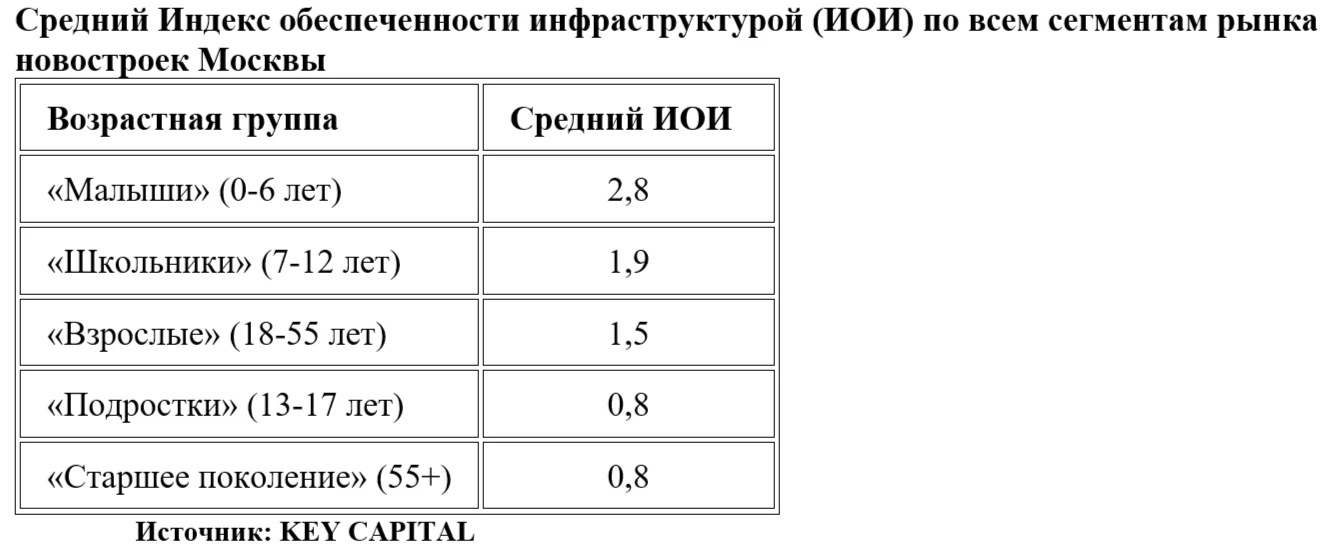 В основу исследования KEY CAPITAL лег анализ 100 жилых комплексов, что составляет почти четверть от всех проектов на рынке новостроек Москвы. Выборка пропорционально отражает структуру предложения по классам жилья и расположению. Для объективной оценки эксперты составили детальный кодификатор, который объединил более 50 типов объектов благоустройства – от песочниц до зон для йоги. На основе этого списка для каждого проекта рассчитывался «Индекс обеспеченности инфраструктурой». Этот показатель отражает, насколько среда отвечает потребностям пяти возрастных групп жителей. Базовый уровень в 1,0 балла означает наличие минимально необходимого набора опций. Значения ниже этой отметки свидетельствуют о дефиците, а выше – о хорошей обеспеченности.
