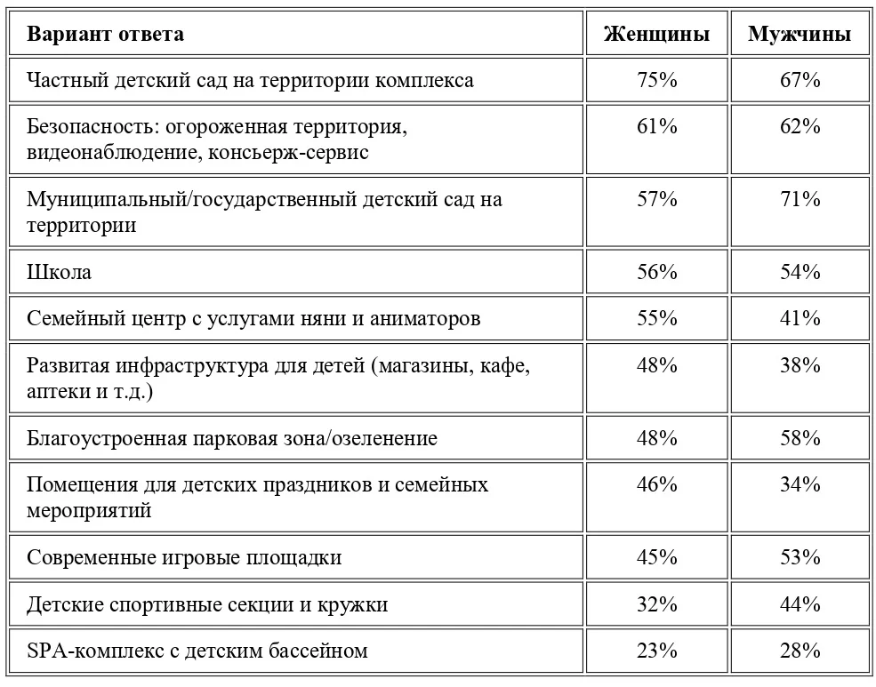 Также эксперты изучила предпочтения мужчин и женщин в отношении опций, предлагаемых в современных жилых комплексах. Интересно, что во взглядах мужчин и женщин наблюдаются определенные различия. Так, женщины (75%) отдают большее предпочтение частным детским садам на территории комплекса, в то время как мужчины (71%) чаще выбирали муниципальные/государственные учреждения. Одинаково важными мужчины и женщины считают школу (54% и 56%).