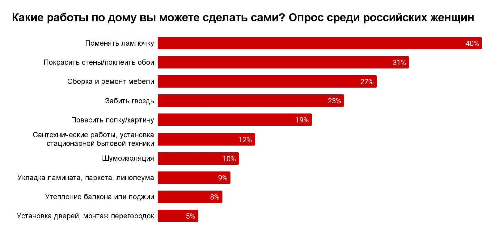 Рассуждая о конкретных работах по дому, 40% опрошенных женщин отметили, что легко могут самостоятельно поменять лампочки, 31% уверены, что справятся с покраской стен и поклейкой обоев, 27% — со сборкой и ремонтом мебели. 23% респонденток умеют сами забивать гвозди, 19% могут повесить полку или картину.