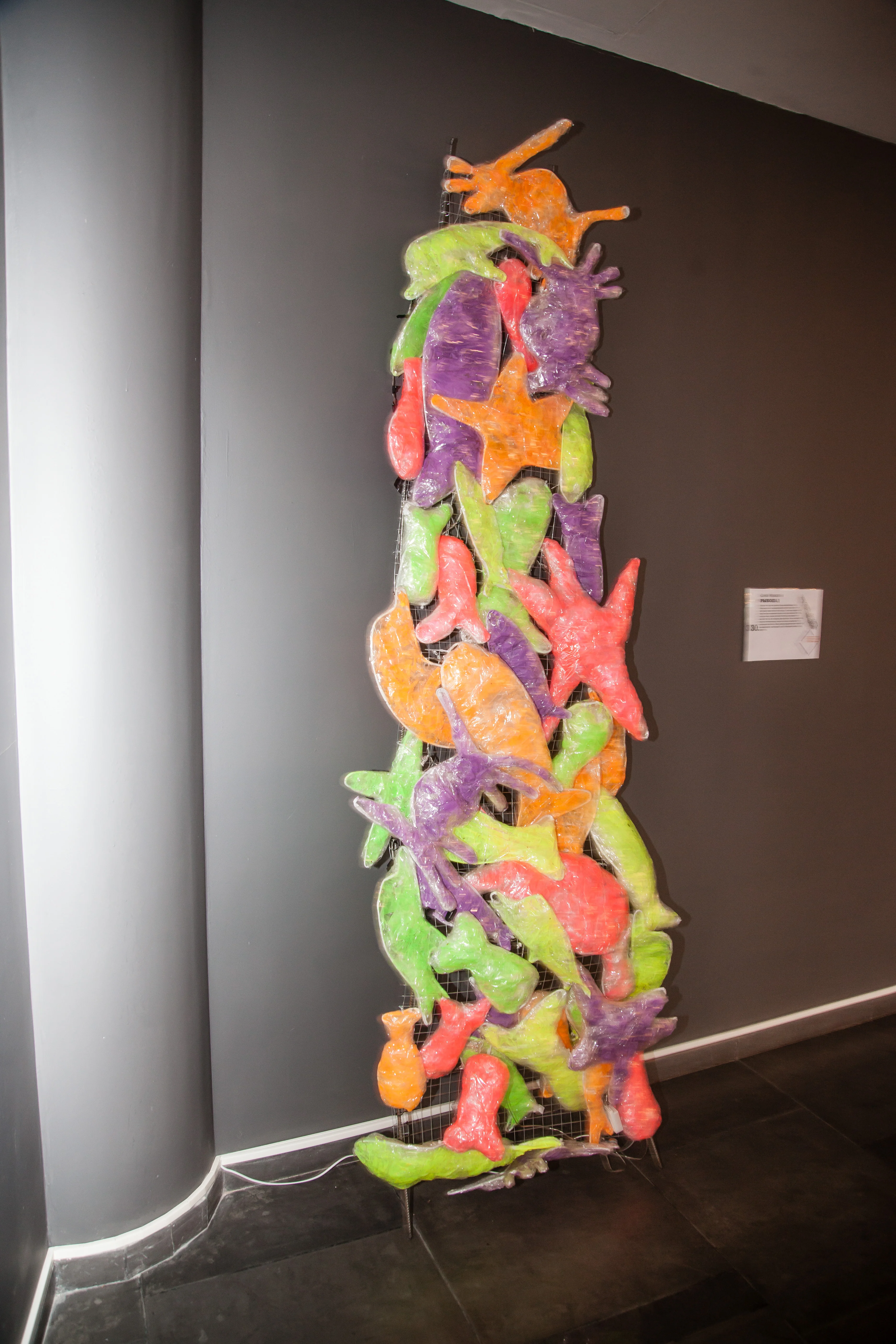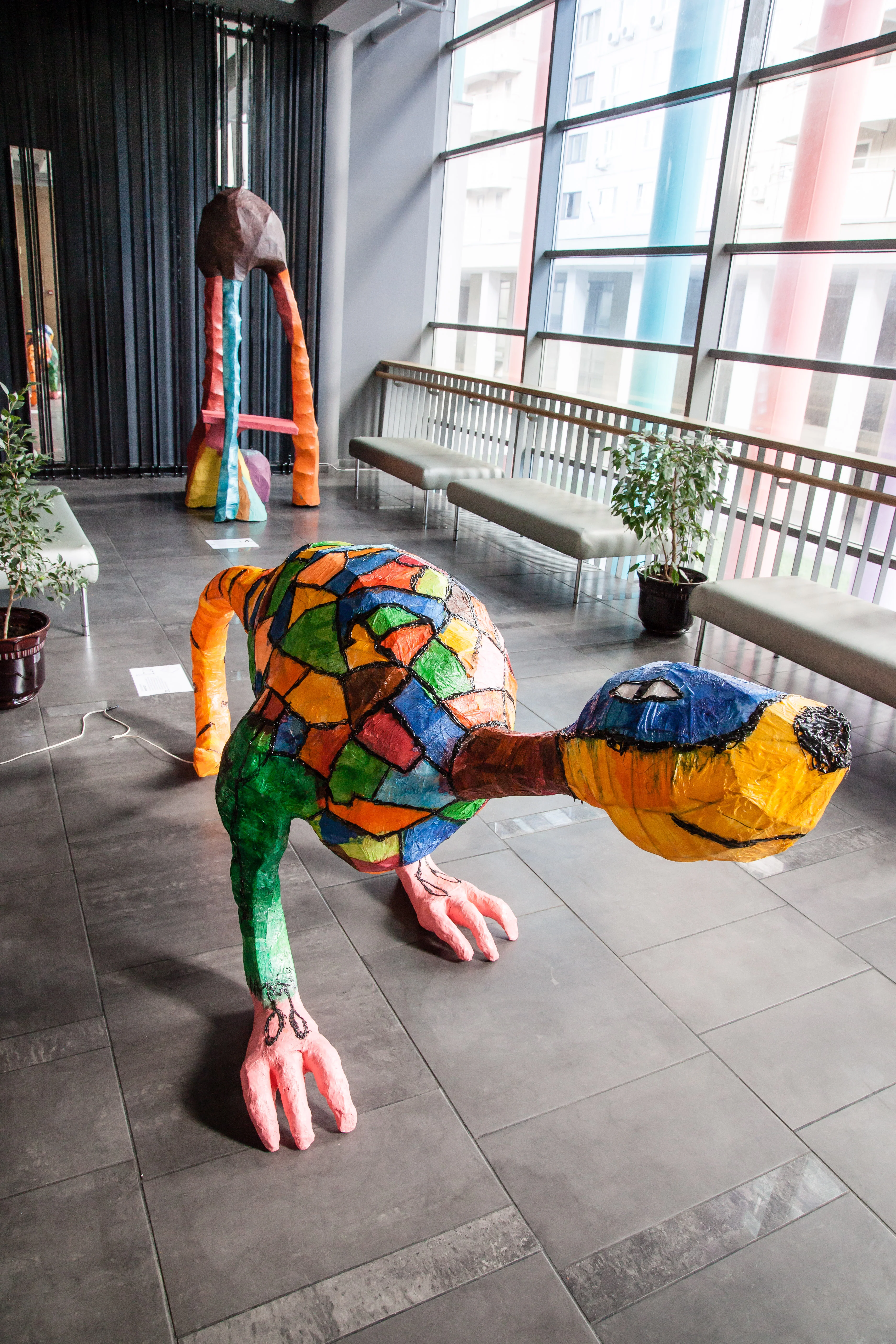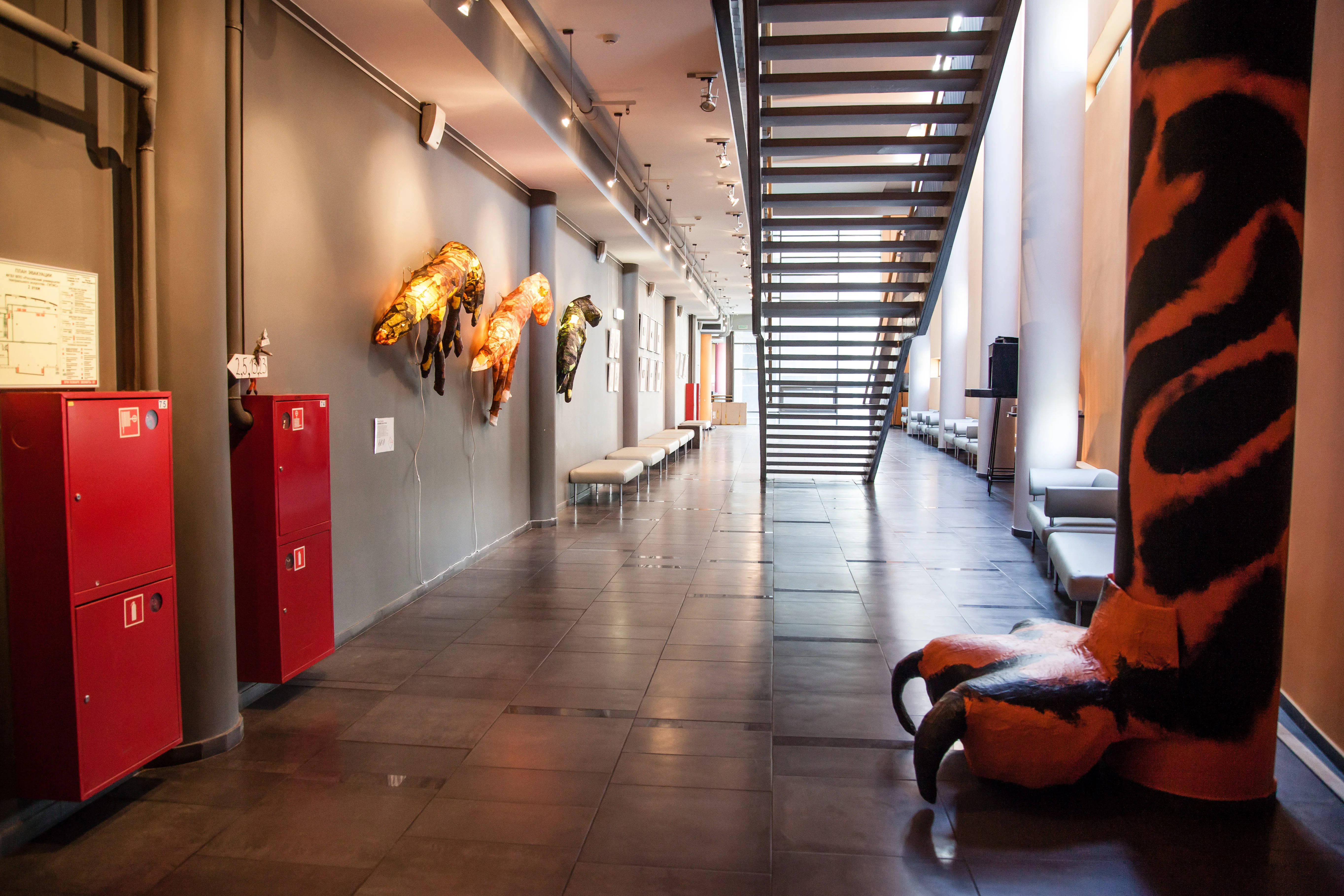 Речь идет не об очередной выставке ДЭЗ №5, но о фундаментальной художественно-дизайнерской работе по анимации (почти джентрификации) большого общественного пространства продуманными усилиями 46 очень молодых авторов. В холлах и закоулках, около гардероба и в кафе, на полу, стенах и в воздухе, – повсюду появились иногда художественные, иногда утилитарно-указующие, иногда призывающие к действию инсталляции и объекты.