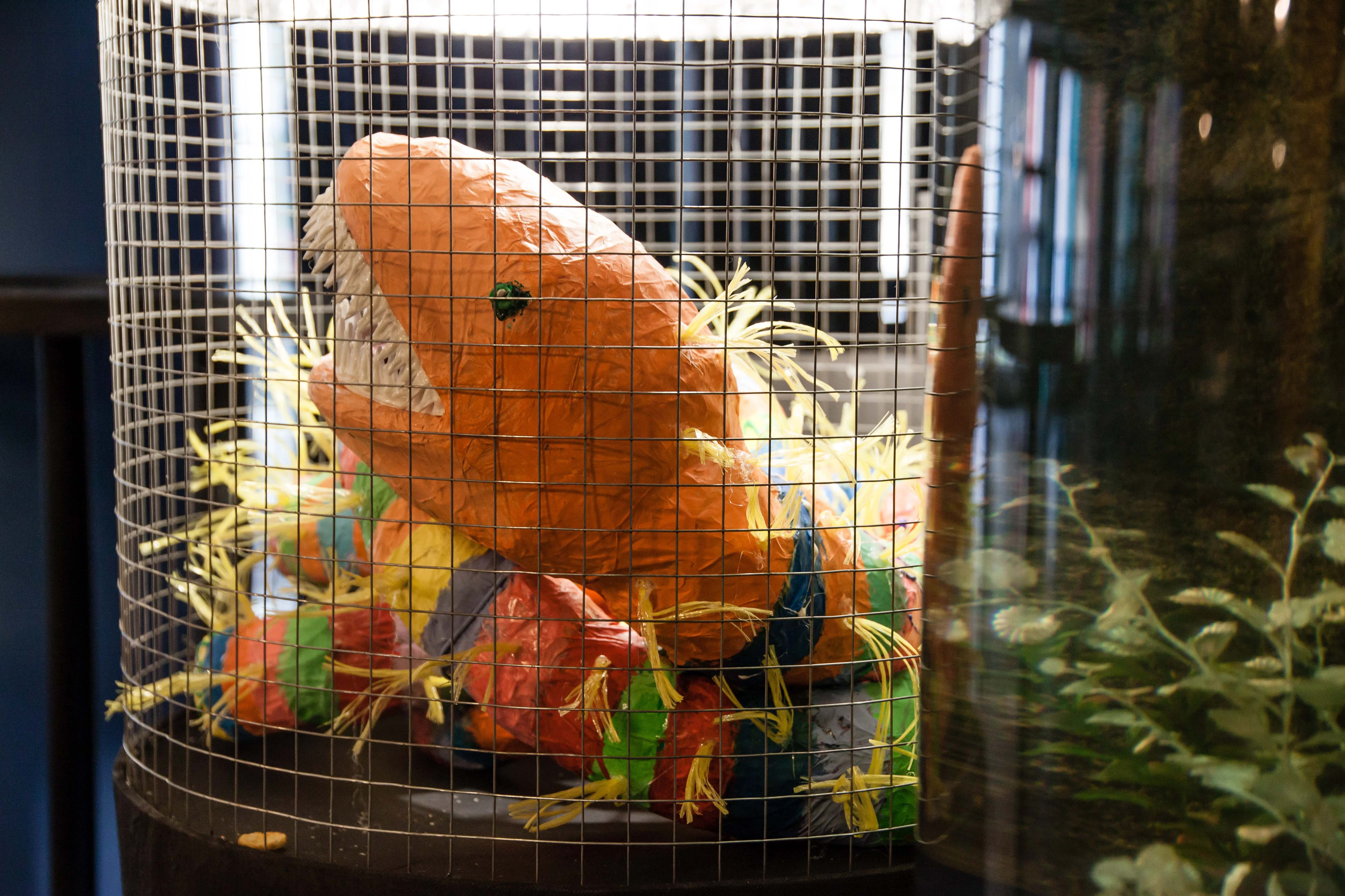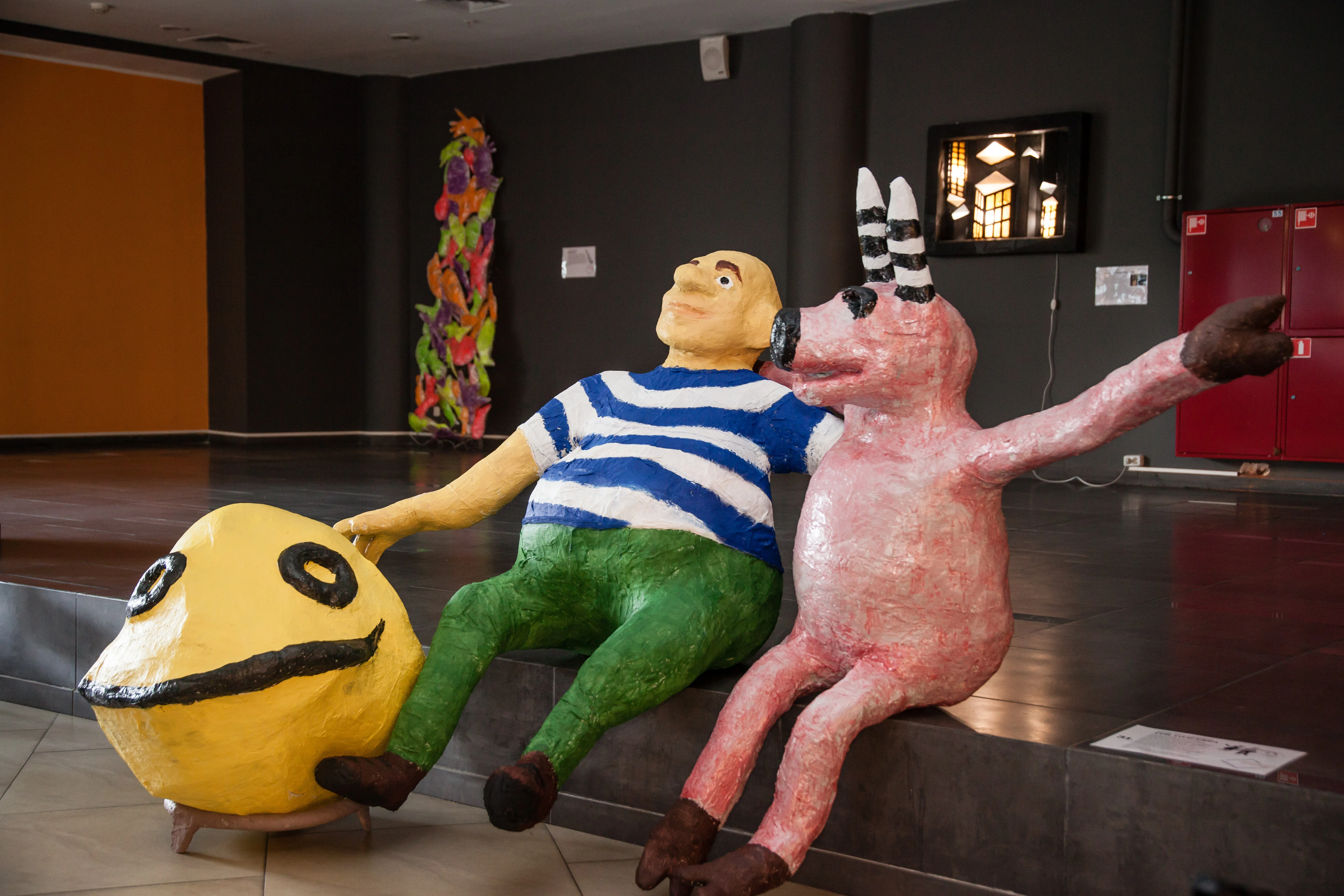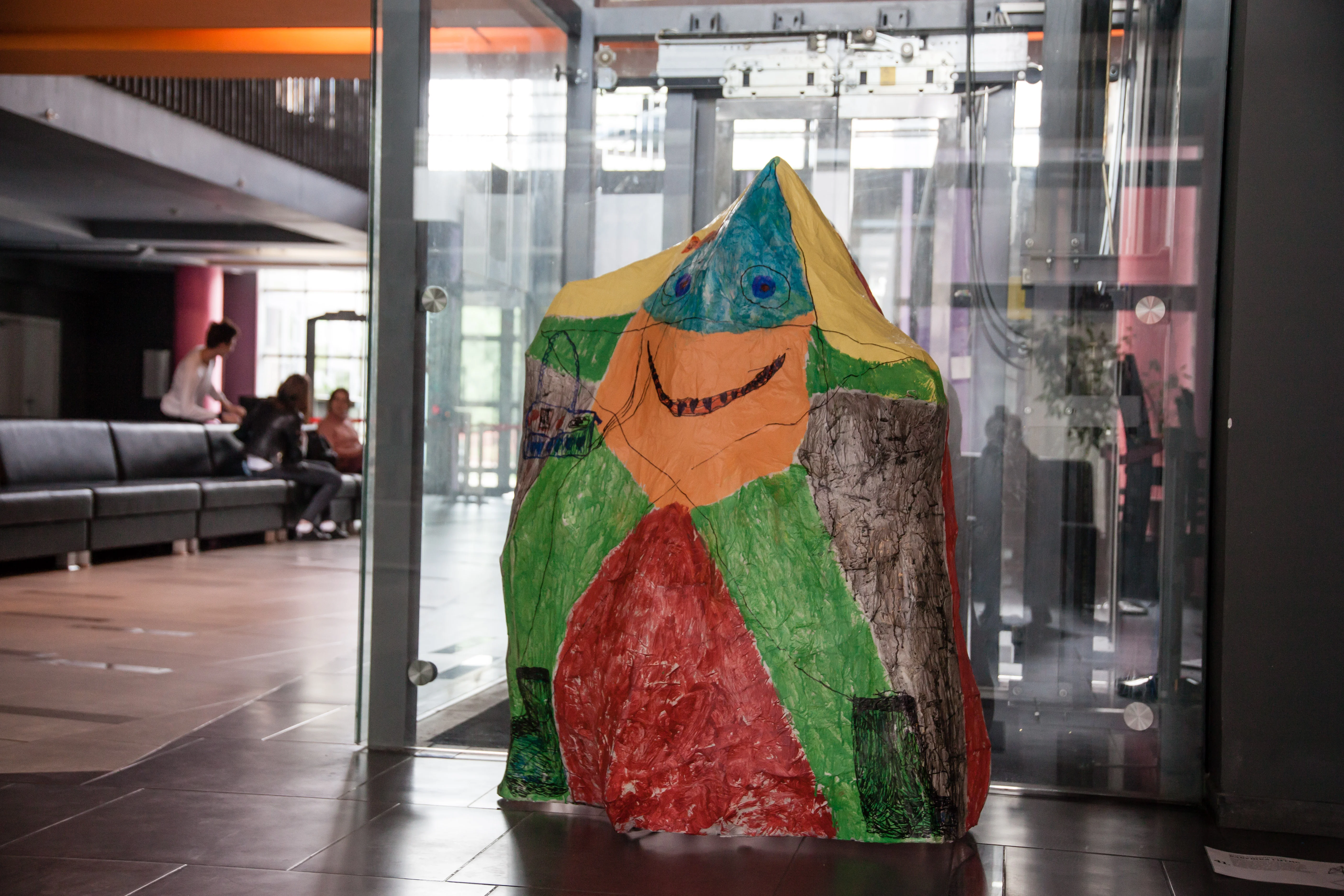 Речь идет не об очередной выставке ДЭЗ №5, но о фундаментальной художественно-дизайнерской работе по анимации (почти джентрификации) большого общественного пространства продуманными усилиями 46 очень молодых авторов. В холлах и закоулках, около гардероба и в кафе, на полу, стенах и в воздухе, – повсюду появились иногда художественные, иногда утилитарно-указующие, иногда призывающие к действию инсталляции и объекты.