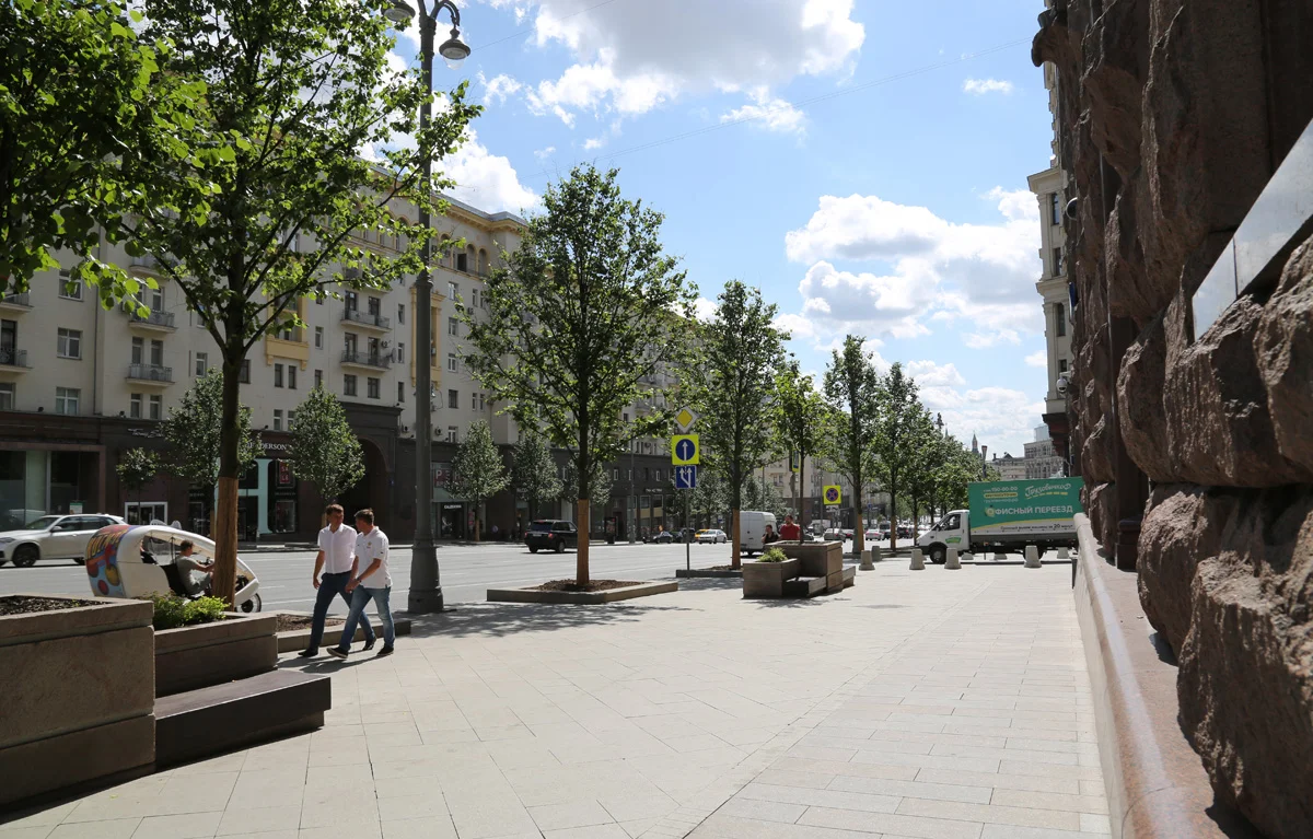 Всего в рамках программы «Моя улица» в Москве в 2017 году появится около 100 новых пешеходных переходов и 200 новых остановочных павильонов. Тротуары в центре расширяют в среднем на три метра, а на дополнительном свободном месте появляются сезонные кафе и торговые павильоны.