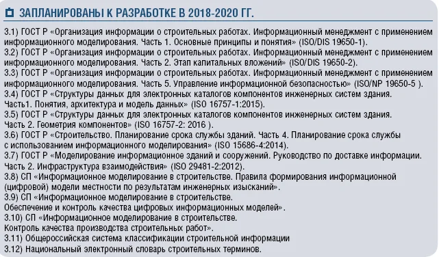 Отметим, что вся эта работа соответствует мировым разработкам и с ними коррелирует. В настоящее время в национальных документах учтено более 90% действующих стандартов ISO. В процессе разработки ряд стандартов ISO, которые будут учтены в национальных документах, запланированных к разработке в 2019-2020 годах, например, ISO/DIS 19650-1, ISO/DIS 19650-2 лягут в основу ГОСТ Р «Информационное моделирование в строительстве. Основные положения, термины и определения».