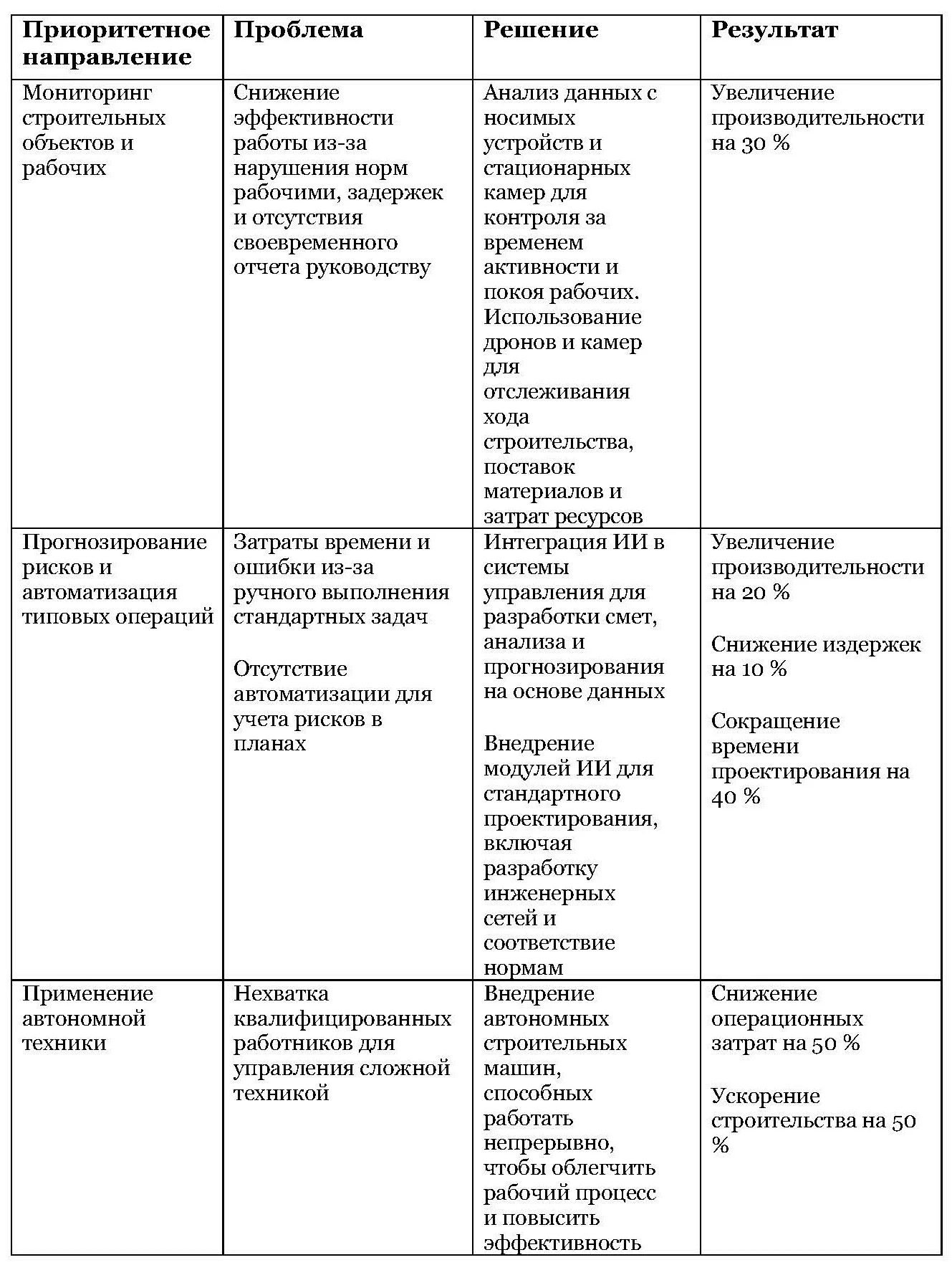 В таблице систематизировали приоритетные направления развития ИИ в строительной отрасли и выделили основные проблемы и пути их решения, а также привели прогноз по результатам применения ИИ.