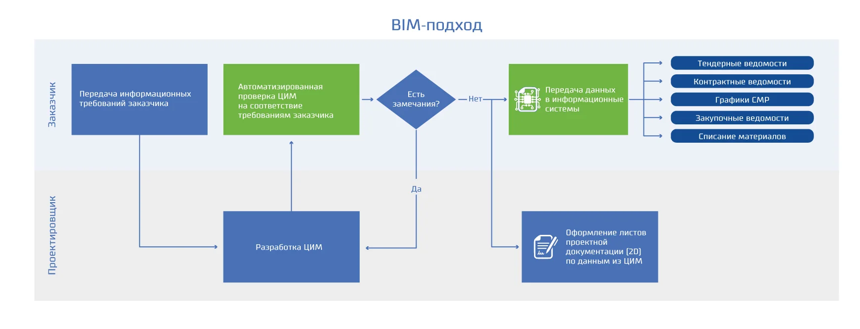 При использовании ТИМ заказчик и проектировщик взаимодействуют совершенно иначе. Цифровая информационная модель (ЦИМ или BIM-модель) не только обладает трехмерной геометрией объекта, но содержит большой массив цифровых данных, представленных в машиночитаемом формате. Это атрибутивные и геометрические данные, информация о координатах, материалах, массе, а также пользовательские поля. После разработки требований к ЦИМ ее используют в различных ТИМ-сценариях: при создании ведомостей объемов работ и материалов (ВОР) и структуры графика производства работ (ГПР) по данным из ЦИМ, при 4D-моделировании, а также при формировании исполнительной и эксплуатационной цифровых моделей.