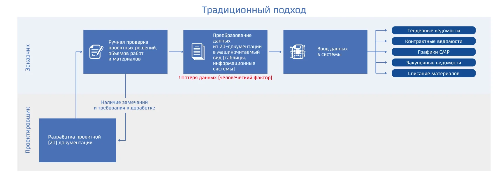 Традиционный процесс взаимодействия заказчика с внешним проектировщиком выглядит следующим образом. Проектировщик разрабатывает проектную документацию в виде набора двухмерных чертежей, затем передает комплект заказчику в бумажном или электронном виде. Двухмерные чертежи содержат алфавитно-цифровые и геометрические данные, которые нужно преобразовывать перед передачей в информационную систему. Делается это, как правило, вручную.