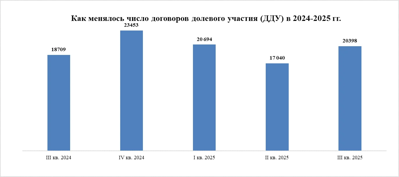 По итогам третьего квартала 2025 года было зарегистрировано 20,4 тыс. ДДУ. Этот результат на 9% превышает показатель третьего квартала 2024 года (18,7 тыс. ДДУ), что говорит о восстановлении рынка после резкого спада во втором квартале (-37% в годовом выражении).