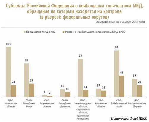 Больше всего домов, находящихся на контроле, по состоянию на 31 декабря 2017 года зафиксировано в Центральном федеральном округе — 101 МКД. В Сибирском федеральном округе таких домов насчитывается 94, в Приволжском — 77, всего же за 2017 год Фондом ЖКХ были проверены 2888 МКД на территории 380 муниципальных образований, 322 дома были включены в реестр обращений по качеству жилья.