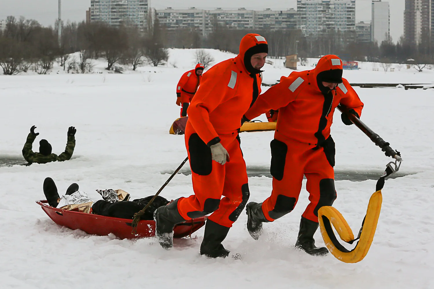 Также в пресс-службе рассказали, что по завершению методического занятия спасатели продемонстрировали практические действия по спасению людей с применением различных видов и средств спасения, в том числе с использованием специализированного телескопического устройства, применением саней «Акья» для транспортировки пострадавшего, раскладыванием устройства спасения из полыньи, спасением при помощи штурмовой лестницы пожарно-спасательного расчета и транспортировкой на СВП «Хивус» и «Змей».