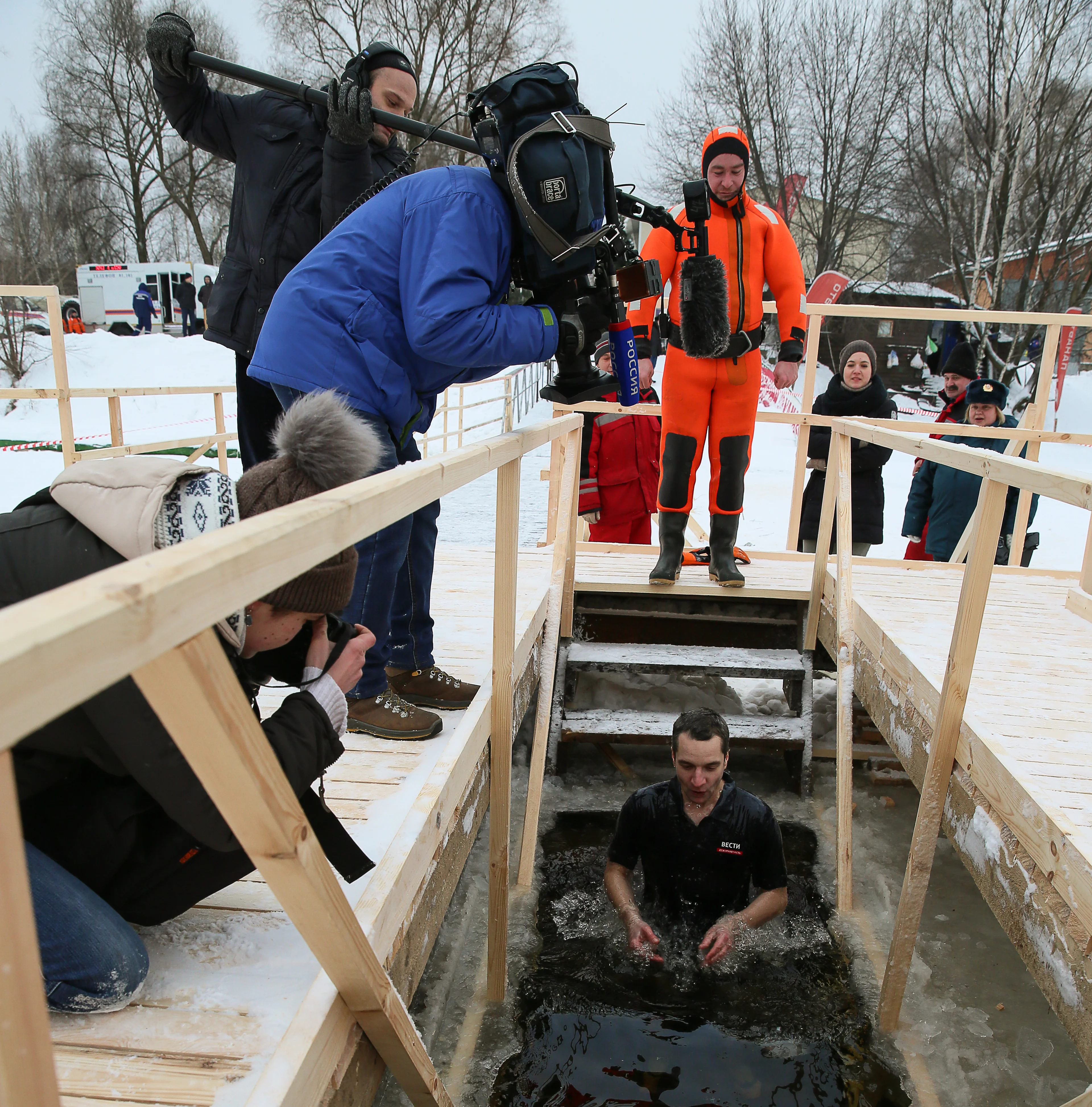 «В Крещенскую ночь силами сотрудников ГУ МЧС России по городу Москве и органов исполнительной власти будут организованы все условия для безопасного купания жителей города и гостей столицы. Каждое место организованного купания в Крещение Господне будет обеспечено специальными подходами с настилами на лед и безопасными спусками, местами для обогрева и переодевания, пунктами горячего питья, освещением. Для проведения обряда омовения органами исполнительной власти столицы совместно с городским главком МЧС подготовлено 60 майн и 11 купелей», – сказал заместитель руководителя территориального органа – главный государственный инспектор по маломерным судам по Москве Владимир Волков.